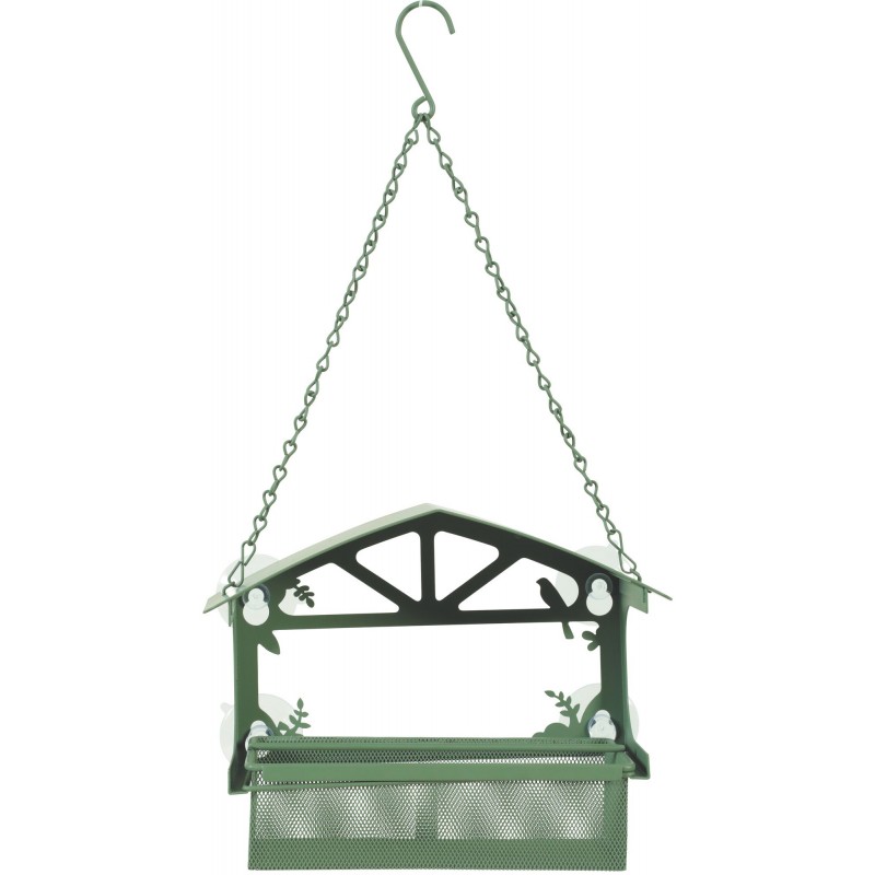 Mangeoire pour oiseaux du jardin. Installation: placez la mangeoire sur votre fenêtre grâce à ses deux ventouses ou à un arbre à l'aide de l'accroche en métal. Les graines sont protégées grâce au toit de la mangeoire. La mangeoire permet de mettre à disposition environ 450g de graines (cette contenance peut varier en fonction du calibre des graines utilisées).|