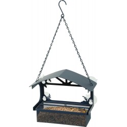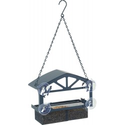 Mangeoire pour oiseaux du jardin. Installation: placez la mangeoire sur votre fenêtre grâce à ses deux ventouses ou à un arbre à l'aide de l'accroche en métal. Les graines sont protégées grâce au toit de la mangeoire. La mangeoire permet de mettre à disposition environ 450g de graines (cette contenance peut varier en fonction du calibre des graines utilisées).|