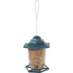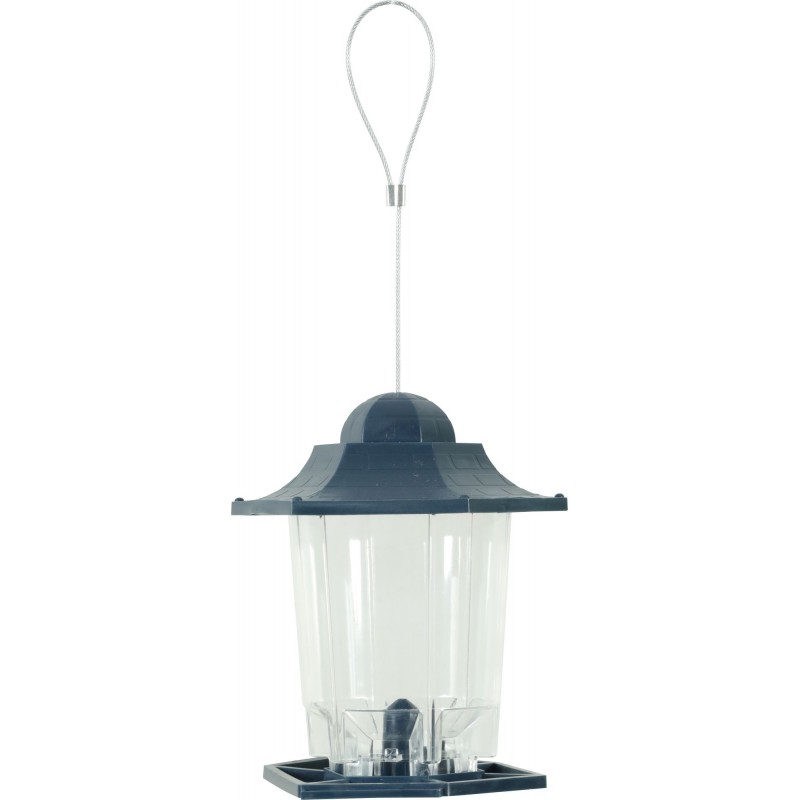 Mangeoire plastique pour les oiseaux du jardin. Elle permet de mettre à disposition environ 400g de graines (cette contenance peut varier en fonction du calibre des graines utilisées). Fourni avec un lien métal résistant permettant de la suspendre.|
