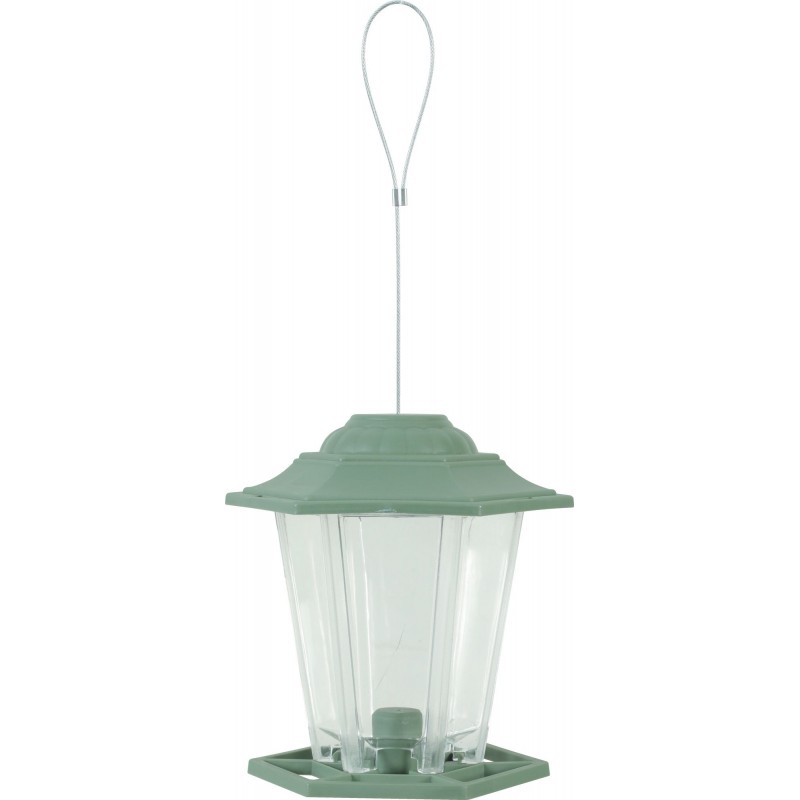 Mangeoire plastique pour les oiseaux du jardin. Elle permet de mettre à disposition environ 700g de graines (cette contenance peut varier en fonction du calibre des graines utilisées). Fourni avec un lien métal résistant permettant de la suspendre.|