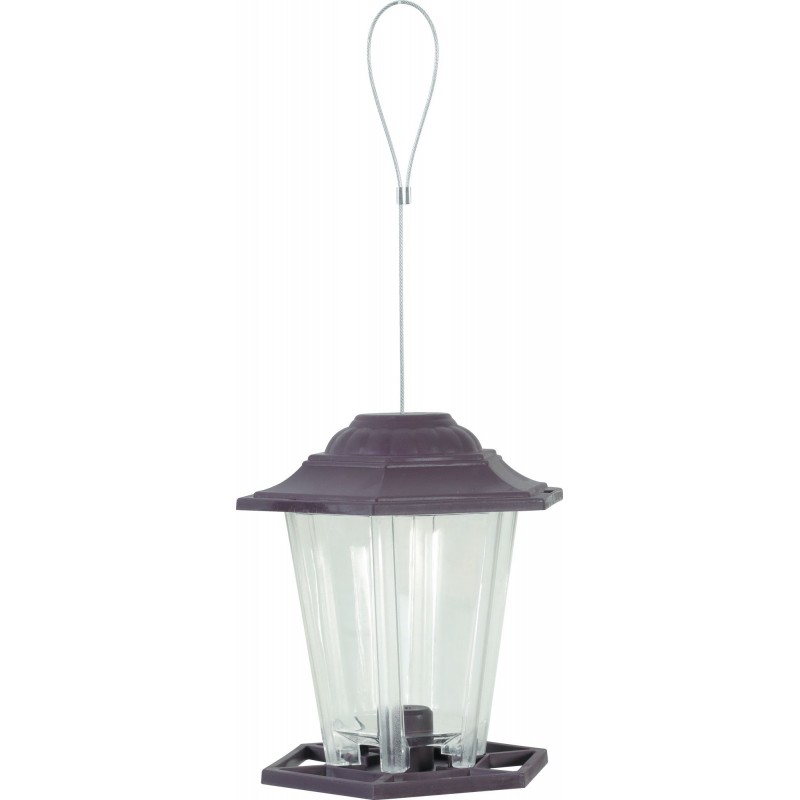 Mangeoire plastique pour les oiseaux du jardin. Elle permet de mettre à disposition environ 700g de graines (cette contenance peut varier en fonction du calibre des graines utilisées). Fourni avec un lien métal résistant permettant de la suspendre.|