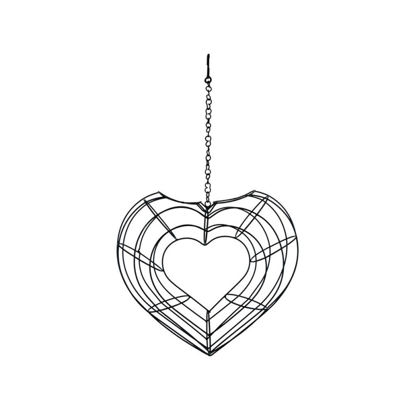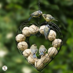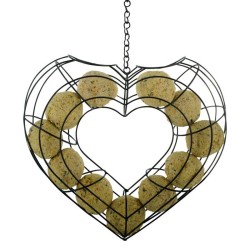 Mangeoire VALENTINE en métal, en forme de coeur, pour boules de graisse. Peut contenir 11 boules de graisse. Remplissage facile par le dessus. Chaînette de suspension fournie.|