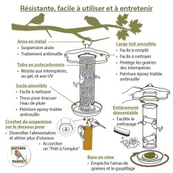 Présence d’un crochet sous la base de la mangeoire pour suspendre d’autres nourritures