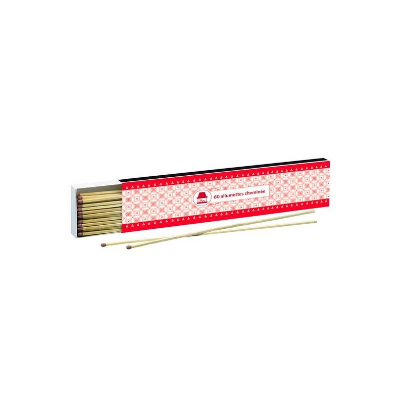 Boîte cheminée de 60 allumettes géantes d'environ 28cm. Allumage facile jusqu'au fond du foyer. Evitent les brûlures.|