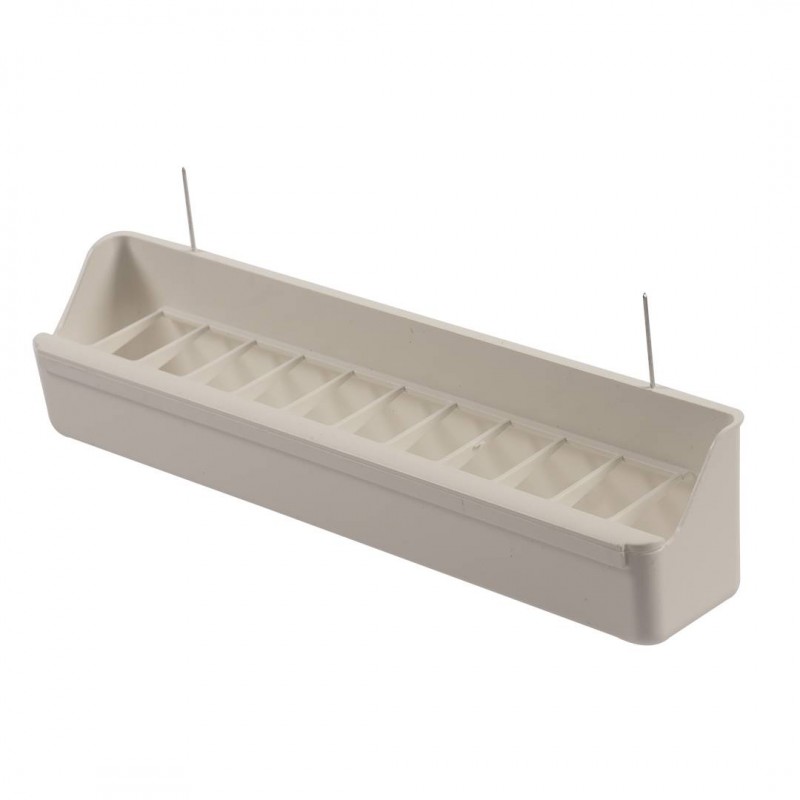Mangeoire transparente en plastique. Facile à placer dans la cage grâce aux crochets.