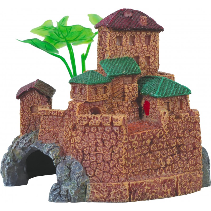 Décoration d'aquarium féérique en résine colorée et non toxique. Riche en détails, cette décoration artificielle en forme de village médiéval, petit modèle, constitue une cachette idéale pour les poissons.|