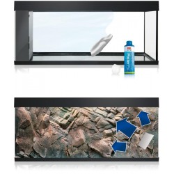 Le poster 4 Rock & AquaScape relève la décoration de votre aquarium de manière impressionnante. La décoration AquaScape moderne d'un côté et les imposantes pierres de l'autre ne laissent rien à désirer en matière d'aménagement d'un monde sous-marin moderne. nous vous conseillons de la fixer avec JUWEL Poster Fix. AQUARIUM DE 120X60CM A 150X60CM