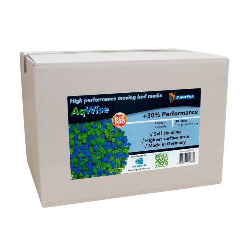 AqWise est adapté pour les filtres flottant comme le filtre Move PolyTech. AqWise est 30% plus performant que tout autre support flottant. Au lieu de 4 rayons, il en dispose de 8 petits supplémentaires qui augmentent la surface d'adhérence des bactéries de 30%. De plus à l'extérieur des anneaux vous trouverez de petits trous pour améliorer le tourbillon. De ce fait, nous optimisons l'échange de l'eau, l'apport d'oxygène et de nutriments.