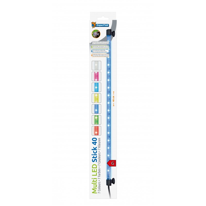 Le Multi LED Stick propose 7 couleurs différentes (rouge, vert, bleu, jaune, violet, bleu clair et blanc) et le mode changement de couleur automatique (démo). • Convient à la fois au-dessus et sous l'eau. • Étanche à l'eau (IP68) et 100% sûr. • LED économes en énergie (12 Volts, 4 Watts). • Facile à fixer au verre de l'aquarium en utilisant des ventouses. • Longueur: 40 cm.|