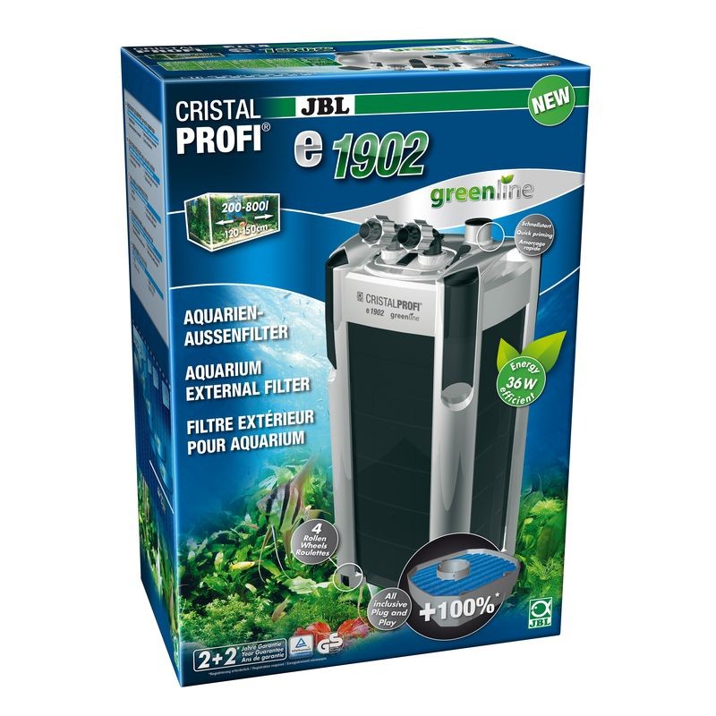 Filtre extérieur pour aquariums de 200 à 800 litres. Filtre extérieur pour une eau d'aquarium saine: circuit d'eau fermé pour aquariums de 200 à 800 litres (120 à 150 cm). Entièrement équipé et prêt à l'emploi: dispositif intégré d'amorçage rapide. démarrage du filtre sans aspiration d'eau Système breveté: haut niveau de filtration biologique. surface de préfiltration doublée. médias filtrants échangeables Contrôlé TÜV. sûr. grande efficacité énergétique: conso 36 W. énorme économie d'énergie. Dim. (LxlxH): 20x23x55.5 cm. Tuyaux et tubes 19/27. crépine d'aspiration. coudes. ventouses. masses filtrantes (billes et mousse de biofiltration).|