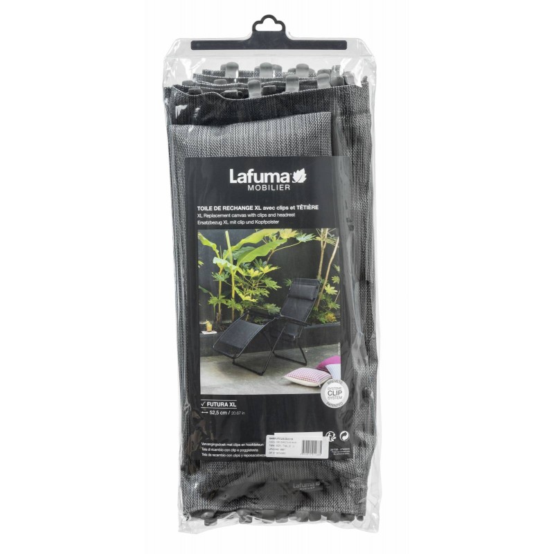 Garniture de rechange pour fauteuil relax FUTURA Batyline® Duo XL, kit toile + tétière coussin, Fixation facile sur la structure du FUTURA XL Lafuma. Toile Batyline® renforcée résistante à la déchirure, à l abrasion, aux UV, aux moisissures. Entretien facile, Séchage rapide.