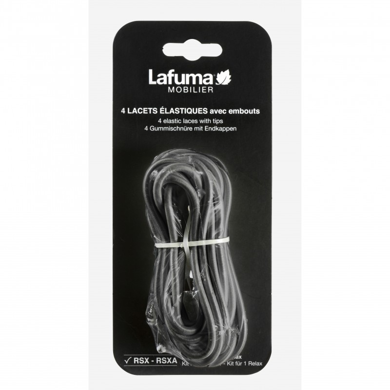 Kit de 4 lacets élastiques pour remplacement du laçage d'origine des fauteuils relax Lafuma RT, RSX et RSXA Facile à installer : fixation rapide de la toile sur la structure du fauteuil relax Lacets résistants : 2 x 140 cm et 2 x 60 cm