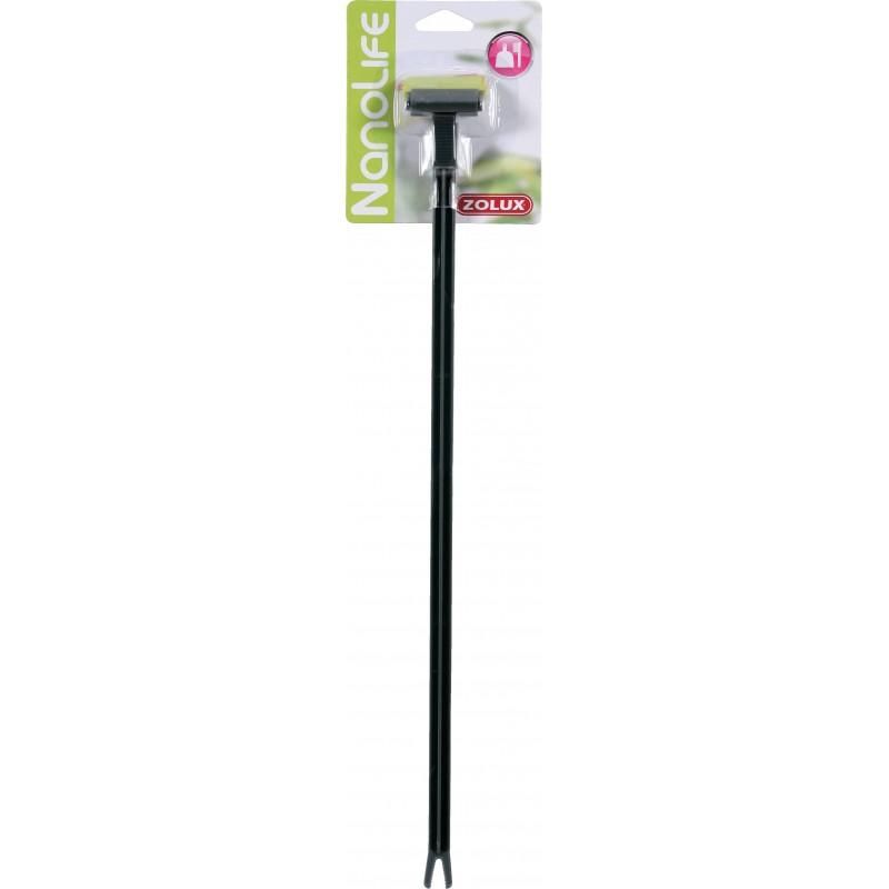 Petit accessoire d'entretien multi-fontions. D'un coté racloir à algues, avec lame de rasoir pour les incrustantes, de l'autre grattoir de sol et plantoir à végétaux.|