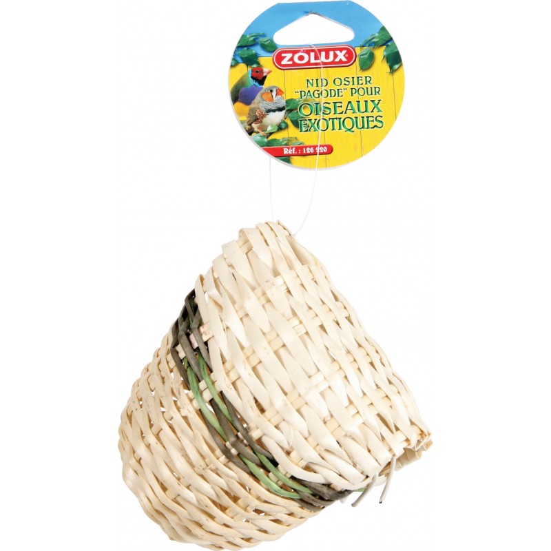 Le nid en osier Pagode apporte une touche d'exotisme dans la cage de vos compagnons ailés! Nid fermé avec une ouverture sur le haud, il permet à la nichée de profiter d'un maximum d'espace. Son aspect neutre est égayé par une band de couleur vert et marron.