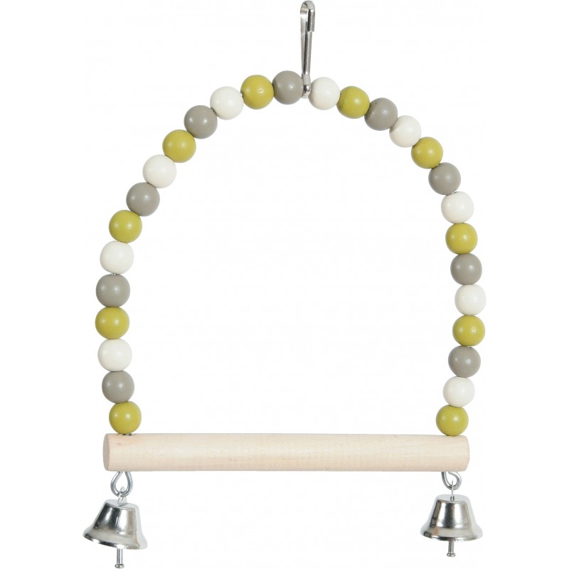 Balancoire perle avec perchoir en bois. Non toxique: peinture conforme aux normes alimentaires (Norme EN71-3). Coloris tendances: vert olive, taupe et beige, en adéquation avec les cages et volières arabesque.|