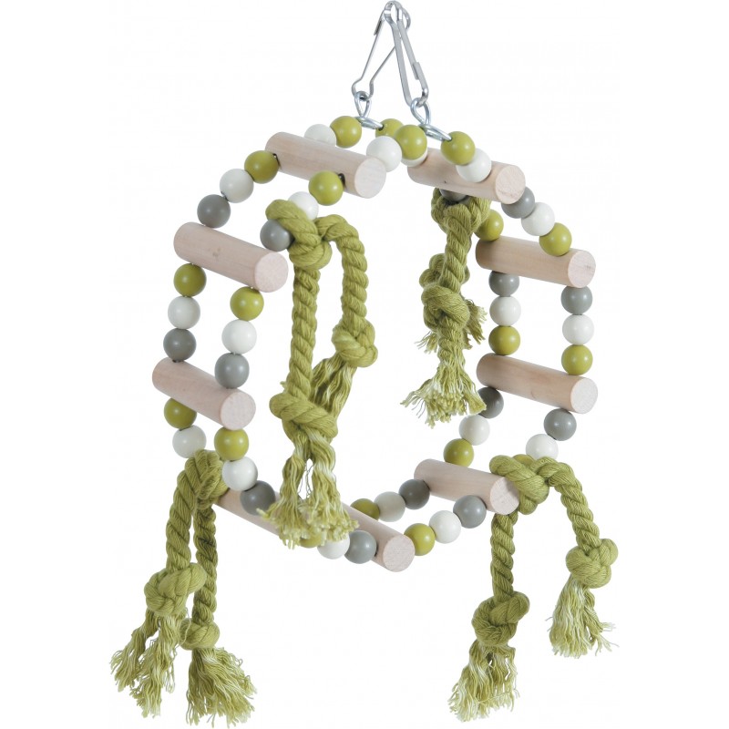 Balancoire roue bois avec corde. Non toxique: peinture conforme aux normes alimentaires (Norme EN71-3). Coloris tendances: vert olive, taupe et beige, en adéquation avec les cages et volières arabesque.|