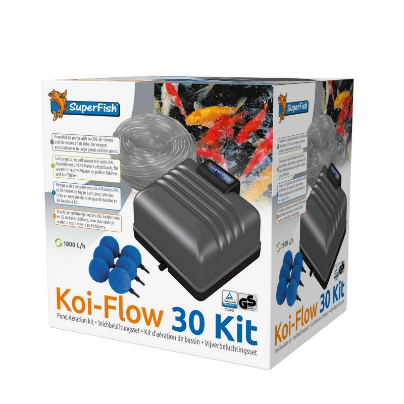 Kit complet Koi-Flow avec ses 6 diffuseurs XXL, son répartiteur et ses 50 m de tuyau. Avec les diffuseurs vous pouvez fournir de l'air à votre bassin ou filtre à plusieurs endroits. Disponible en trois versions.|
