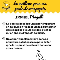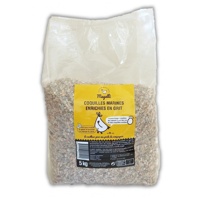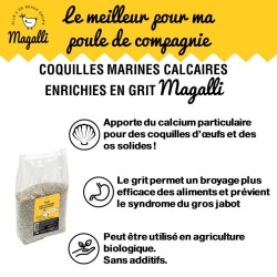 - facilite sa digestion en lui permettant de « mâcher » mécaniquement ses aliments dans son gésier. La présence de grit permet en effet de muscler le gésier de Magalli, de broyer ses aliments plus efficacement et de favoriser la vidange de son jabot. Il est également recommandé pour les poules dont le jabot est encombré par des un amas de corps étranger des graines, de l’herbe avalée en quantité ou de trop gros cailloux par exemple. Les coquilles marines enrichies en grit Magalli sont lavées, séchées, chauffées, tamisées et brisées. Aliment minéral 100% naturel, les coquilles marines enrichies en grit peuvent être utilisées en agriculture biologique conformément aux règlements (CE) N°834/2007 et (CE) N°889/2008. Elles sont sans additifs.