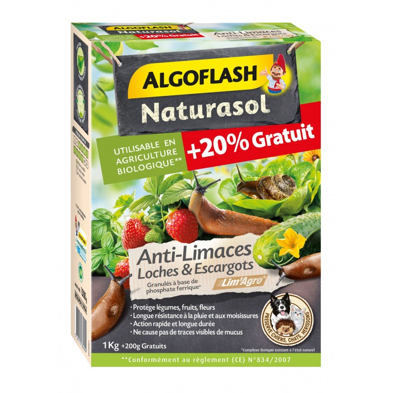 Appât granulé anti-limaces prêt à l?emploi. A base de phosphate de fer, un complexe ferrique minéral naturel qui est transformé en éléments nutritifs par les micro-organismes du sol. Il permet de lutter efficacement contre toutes les espèces de limaces, loches et escargots qui envahissent vos potagers, semis, pelouses et massifs ornementaux. Longue résistance à la pluie et aux moisissures. Préserve les animaux domestiques et les hérissons. Utilisable en Agriculture Biologique*.