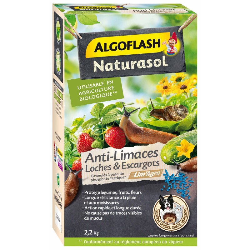 Appât granulé anti-limaces prêt à l’emploi. A base de phosphate de fer, un complexe ferrique minéral naturel qui est transformé en éléments nutritifs par les micro-organismes du sol. Il permet de lutter efficacement contre toutes les espèces de limaces, loches et escargots qui envahissent vos potagers, semis, pelouses et massifs ornementaux. Longue résistance à la pluie et aux moisissures. Préserve les animaux domestiques et les hérissons. Utilisable en Agriculture Biologique*.|MENTIONS OBLIGATOIRES:
