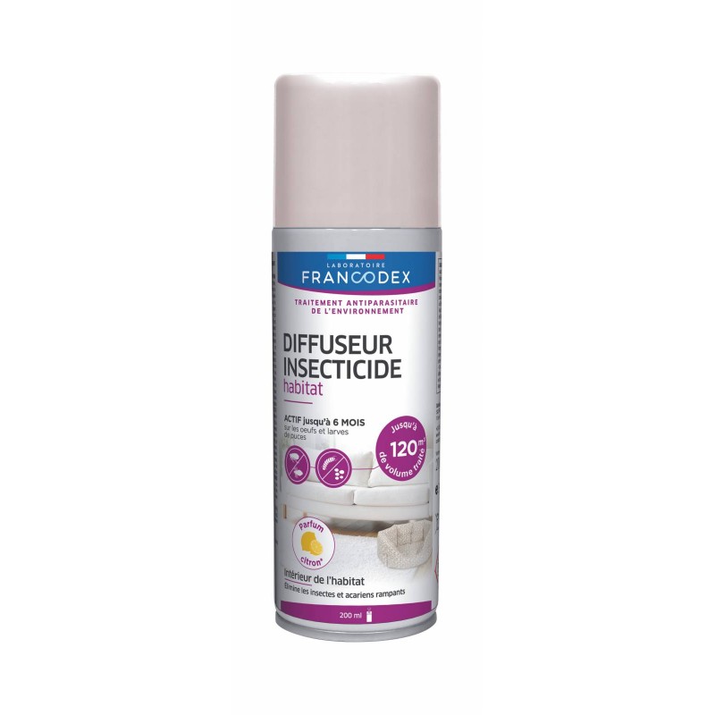 Le DIFFUSEUR INSECTICIDE ENVIRONNEMENT PARFUM CITRON FRANCODEX contient de la perméthrine, insecticide et acaricide puissant à action immédiate et durable, ainsi