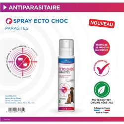 CONSEILS D'UTILISATION: Pulvériser le produit, à 20 cm de la peau, aux endroits où se trouvent les parasites, en évitant le contour des yeux et les muqueuses. ECTO CHOC PARASITE agit par contact direct sur les parasites rampants et volants. Empêcher l'animal de se lécher quelques minutes en attendant le séchage du pelage puis essuyer ou brosser l'animal pour éliminer les parasites. Le nombre de pulvérisations sera à adapter à la situation. En cas d'infestation massive sur l'animal, mouiller tout le corps (3 à 6 pulvérisations par kg de poids), à adapter selon la nature et la longueur du pelage, ou utiliser le brumisateur ECTO CHOC PARASITE DUO. Attendre une semaine avant de renouveler l'application si des parasites sont toujours présents.