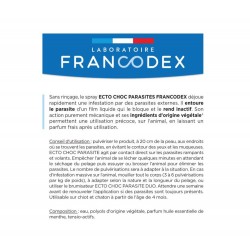 Sans rinçage, le spray ECTO CHOC PARASITES FRANCODEX déjoue rapidement une infestation par des parasites externes. Il entoure le parasite d'un film liquide qui le bloque et le rend inactif. Son action purement mécanique et ses ingrédients d'origine végétale* permettent une utilisation précoce, sur l'animal et dans son environnement, en laissant un parfum frais après utilisation.