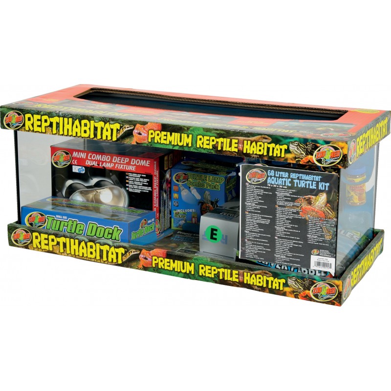 Terrarium de 68 litres pour tortues aquatiques avec couvercle coulissant inoxydable. Le kit est composé de: 1 Mini deep dome 2x100 watts. 1 Lampe chauffante repti Tuff. 1 lampe fluo compacte UVB. 1 Filtre intérieur hydor. 1 turtle dock. Des Galets river pebbles. 1 Reptisafe conditionneur d'eau. 1 themometre reptiles. 1 Bloc de calcium Dr Turtle. De la nourriture tortues aquatiques. 1 livre de soins sur les tortues aquatiques en anglais (version française téléchargeable).|