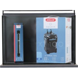 Une filtration externe Xternal 100: Silencieux, il possède un pied anti-vibration. Comprends les cannes et buses d'aspiration et de rejets (dont barre de pluie) ainsi que les tuyaux (1,5M pour l'entrée et la sortie. Diamètre de 12/16) ventouses et crépine. Le câble d'alimentation mesure 1,3m et la cuve possède un volume proche de 7L. Comprends 2 paniers livrés avec mousse bleu, perlon et zéolithe. Consommation: 9,3W. Débit maximum: 750L/H. Dimensions filtre: L18 x p19,5 x h30 cm.