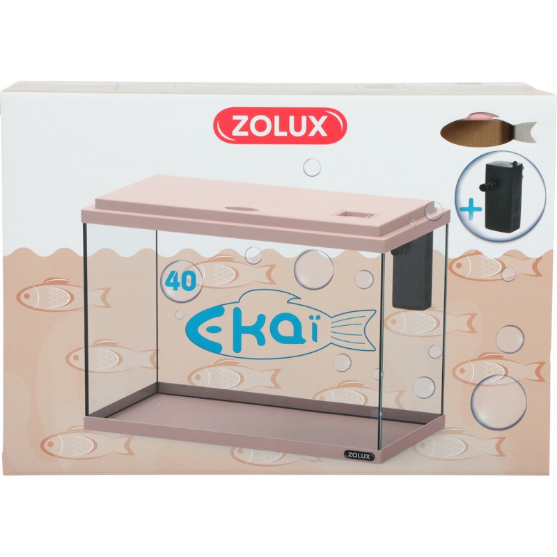 Kit aquarium EKAI en verre de 3 mm, fournit avec un couvercle sur charnières doté d'une trappe de nourrissage. Equipé d'un filtre EKAÏ 200 - 170L/H réglable, comprenant deux masses de filtration: une mousse bleu et une cartouche de charbon.|