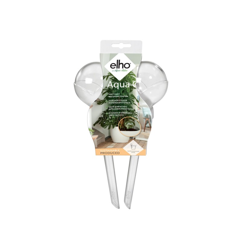 Votre excuse c'est je n'ai pas la main verte" ? Avec l'aqua care d'elho. ce n'est plus possible. Ce système d'arrosage simple et adapté à toutes vos plantes garantit un apport d'eau optimal. Remplissez d'eau la boule et enfoncez la tige en diagonale dans la terre pour passer sous les racines. facile et rapide. Le système d'arrosage aqua care libère l'eau dès que la plante en a besoin. Le système aqua care est incassable et dispose d'un large bec pour ne pas être obstrué par la terre. Parfait lorsque vous partez en week-end !