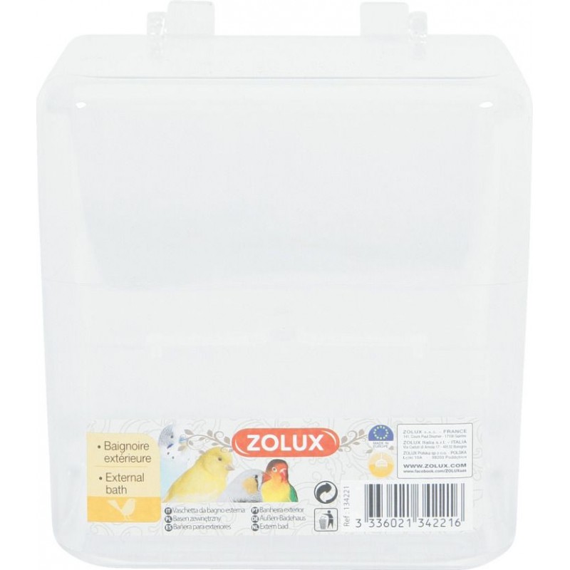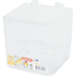 Baignoire extérieure de forme cubique. Fabriquée en plastique, entièrement transparente. Ses crochets lui permettent de se clipser sur la cage.|