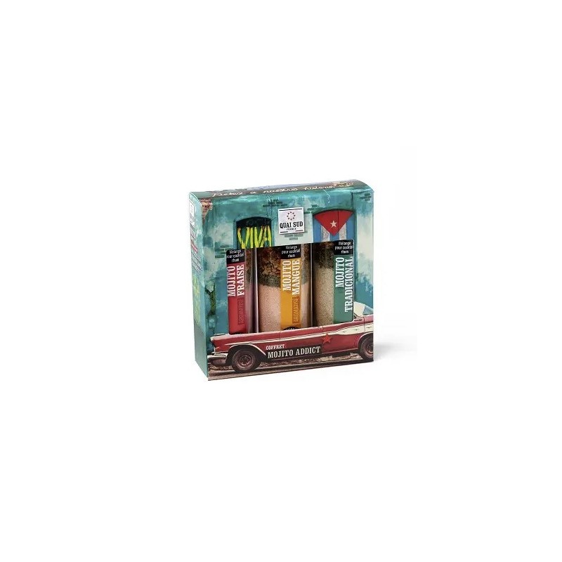 Ingrédients : Mélange pour cocktail Mojito fraise: sucre de canne, écorces de citron, morceaux de fraises 4,5 %, feuilles de menthe, poudre de fraise 0,9 %, colorant naturel carmin, arôme naturel goût fraise 0,2 %, arôme naturel de limette, arôme naturel de menthe.Mélange pour Mojito Tradicional : sucre de canne, écorces de citron, feuilles de menthe, arôme naturel de citron vert, arôme naturel menthe.Mélange pour Mojito mangue : sucre de canne, écorces de citron, morceaux de mangue (mangue, sucre, acide citrique, E220 (sulfite)) 9,1 %, feuilles de menthe, arôme naturel de citron vert, arôme (mangue) 0,2 %, arôme naturel de menthe, colorant E110 jaune soleil. Peut avoir un effet nuisible sur l activité et l attention des enfants.