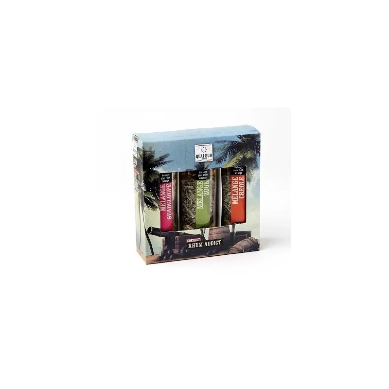 Ingrédients : Mélange pour rhum Créole : citronnelle, écorces de citron, bâtons de cannelle, morceaux de gingembre, feuilles de menthe, feuilles de bigaradier, macis, badiane étoilée, clou de girofle, graine de cardamome.Mélange pour rhum Zouk : citronnelle, écorces d orange, morceaux de mangue (mangue, sucre, acide citrique, E220 (sulfite)), écorces de citron, morceaux d ananas (sucre, ananas, acide citrique) et de pamplemousse, tranches de bananes (banane, huile de coco, sirop, arôme naturel de banane).Mélange pour rhum Guadeloupe : rubans de noix de coco, fèves de cacao torréfiées, pétales de fleur d oranger, bâtons de cannelle, grains de café, feuilles de bigaradier.