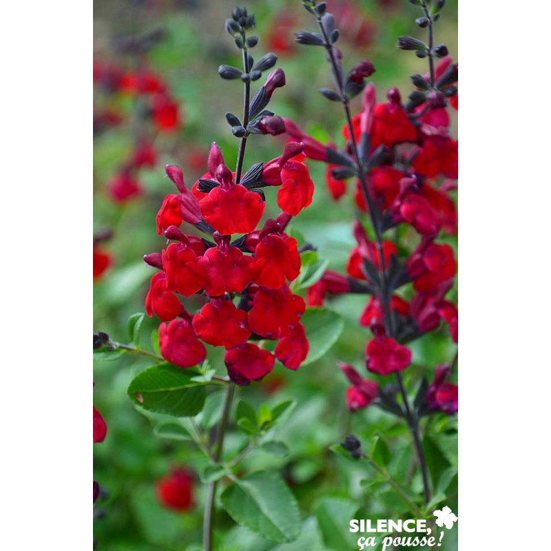 Sauge très florifère à feuillage vert très odorant. Fleurs rouge profond rehaussé par le calice brun foncé.