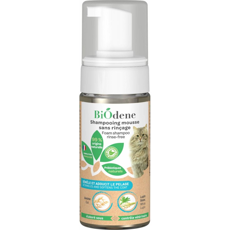 Les chats apprécient peu d'être mouillés mais l'entretien de leur pelage est utile pour une bonne hygiène. Adapté à tout type de pelage, le SHAMPOOING MOUSSE SANS RINÇAGE BIODENE contient de l'avoine aux propriétés apaisantes, et du lupin qui renforce la barrière cutanée et hydrate la peau. Les plantes soigneusement sélectionnées facilitent le démêlage et laissent un pelage doux. Le prébiotique d'origine naturelle favorise le développement de microorganismes bénéfiques pour la peau. Sans sulfate, avec son parfum naturel et son pH physiologique, le shampooing délivre une mousse facile à utiliser, permettant un usage régulier et agréable.