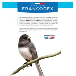 Les oiseaux apportent un soin particulier à leur toilette et apprécient d'avoir un plumage bien entretenu. Conçu pour le plaisir de vos oiseaux, le SPRAY DOUCHE FRANCODEX participe à leur hygiène. L'aloé vera hydrate et nourrit leur peau, pour donner un plumage brillant. Incolore et sans résidus, l'usage du spray ne modifie pas la couleur naturelle des oiseaux et ne laisse pas de traces.