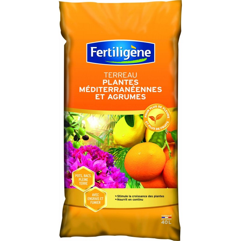 Terreau agrumes et plantes méditerrannéennes 40 L.Ce terreau est parfaitement adapté à toutes les plantes méditerrannéennes et agrumes. avec engrais : stimule la croissance et avec fumier pour une nutrition continue ce qui permet d'avoir plus de fleurs et plus de fruits.Support de culture NF U44-551. Terreau avec engrais CE.. Fabriqué en France