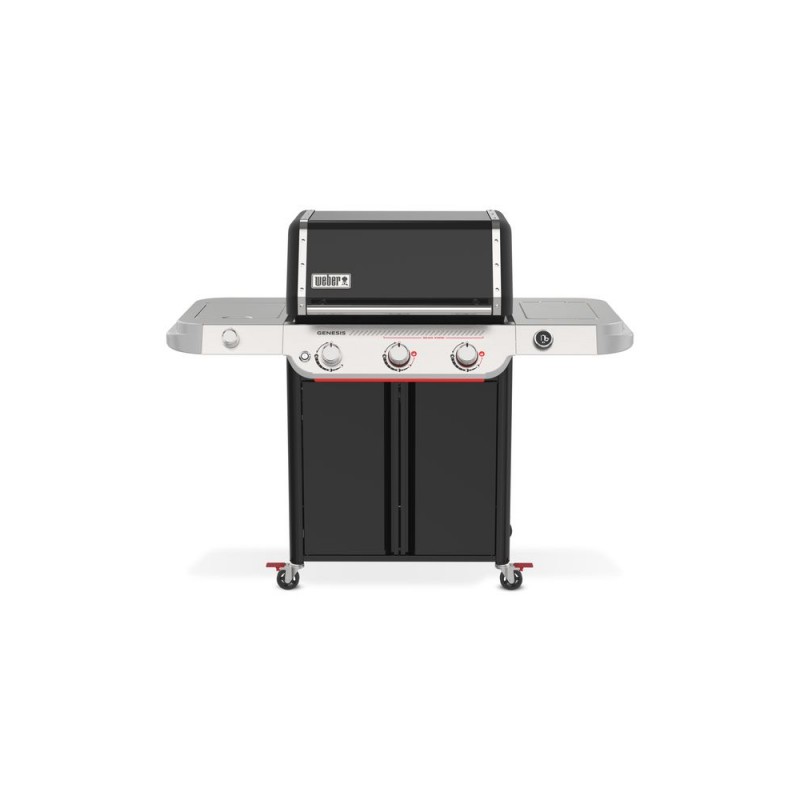 Barbecue gaz Genesis E-335 équipé de 3 brûleurs en acier inoxydable et 1 réchaud latéral de 3,5kW. Grande zone de cuisson. Allumage piezo électronique. Barres flavorizers en acier inoxydable. Surface de cuisson : 68 x 48 cm, grilles de cuisson Weber Crafted GBS en fonte émaillée. Grille de réchauffe fixe. Thermomètre digital. Tablette latérale en acier inoxydable compatible avec la gamme accesoires Weber Works. 4 crochets porte ustensiles. 4 roulettes dont 2 verrouillables. Espace de rangement pour une bouteille de 13kgs. Garantie 12 ans cuve et couvercle. Nombre de personnes : 16|