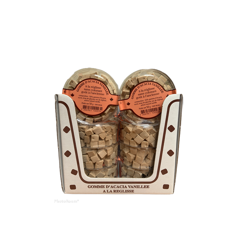 Des gommes d’acacia vanillée alliant plaisir gourmand et santé. Goût et saveur naturelle à l’ancienne. Mélange subtil de vanille et de réglisse sans colorant. Un conditionnement malin en petites boites pratiques à transporter.|