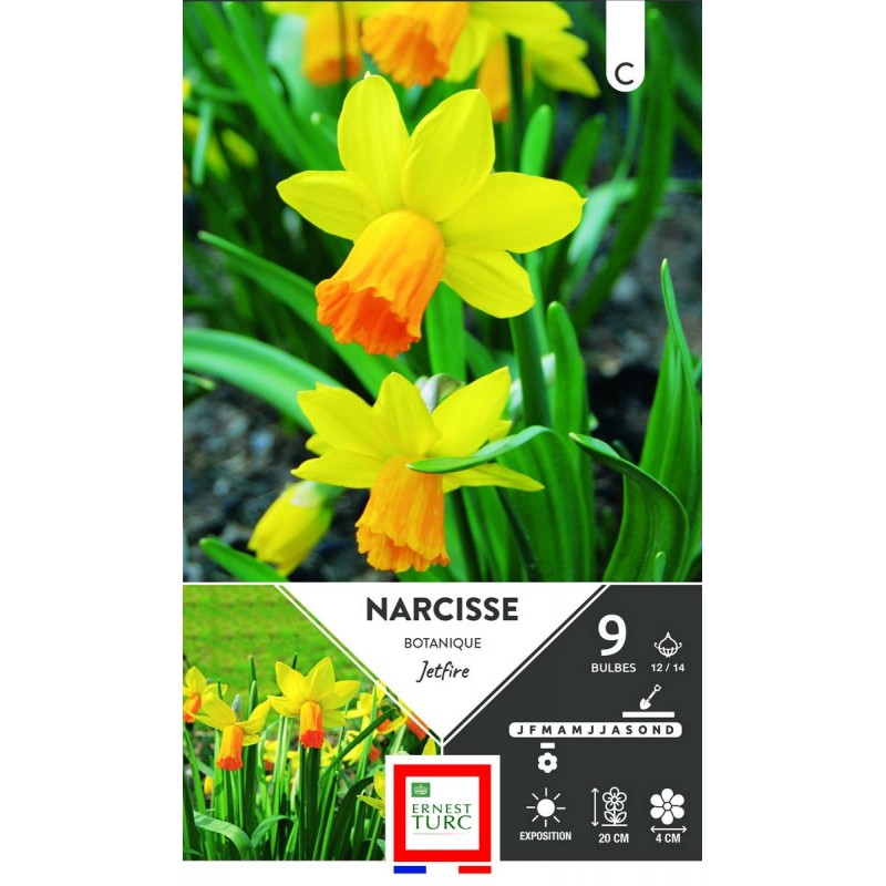 Ce petit narcisse de 20 cm de hauteur produit des fleurs jaunes à la trompette orange.