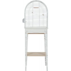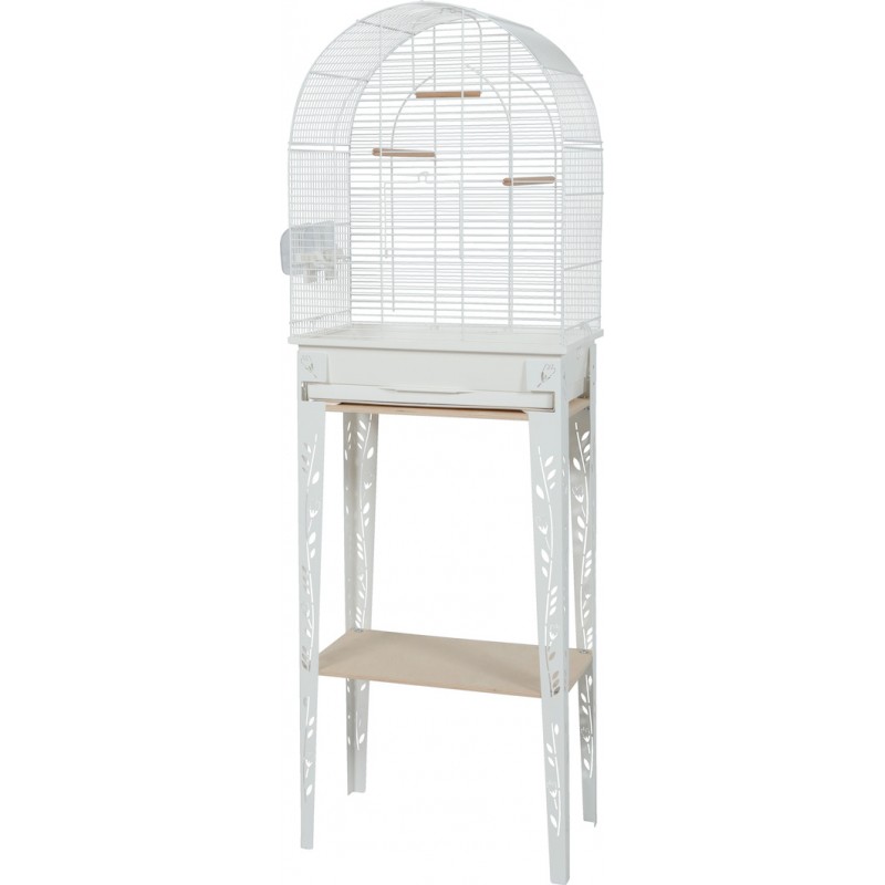 Cages design pour oiseaux domestiques vendues avec leur meuble et très faciles à monter! La collection Patio propose des cages arrondies conçues dans l’esprit Patio / floral avec 4 pieds en métal décorés (motifs floraux). Les meubles sont équipés de 2 étagères en bois (une pour le soutien de la cage et une seconde pour du rangement). Les cages sont équipées de: 2 perchoirs en bois, 1 balançoire en bois et 2 abreuvoirs en plastique. Pratique: Le nettoyage du bac ne nécessite pas de déplacer la cage, il suffit de simplement retirer le tiroir, le nettoyer et le repositionner. La taille Medium est conçue pour des espèces comme les oiseaux exotiques ou les canaris. 2 coloris au choix: blanc mat ou noir mat.|