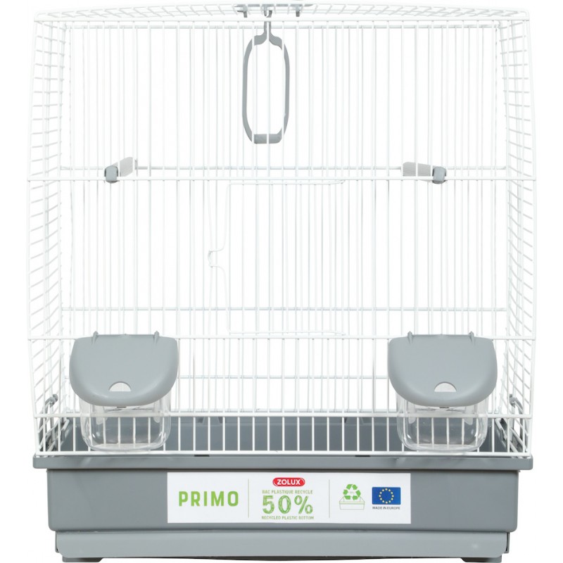 La cage éco-conçue PRIMO Carla pour oiseaux domestiques avec bac en plastique 50% recyclé. Elle s'intègrera facilement dans les intérieurs grâce à ses coloris classiques et actuels gris clair et blanc.