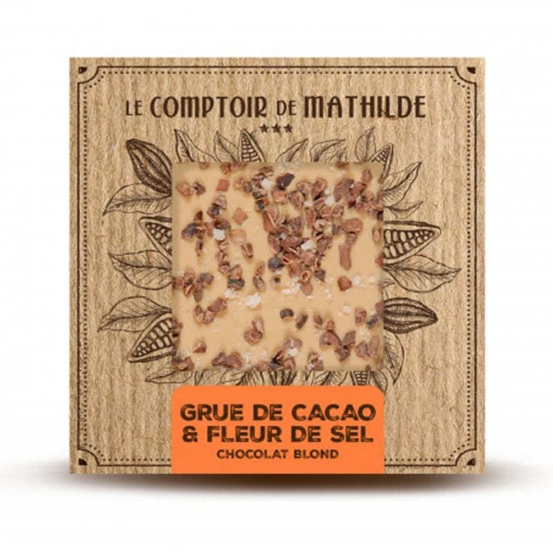 Chocolat blanc au caramel 95,6% (Sucre, beurre de cacao, poudre de LAIT entier, poudre de caramel avec matière grasse LAITière 10,5% (poudre de LAIT écrémé, lactosérum en poudre (LAIT), sucre, matière grasse LAITière anhydre, arôme naturel de vanille), sucre du LAIT, lactosérum en poudre (LAIT), poudre de LAIT écrémé, sucre caramélisé 1,75%, émulsifiant: lécithine de SOJA, sel, arôme naturel de vanille), grué de cacao caramélisé 3,8% (fèves de cacao 70%, sucre, caramel (sucre, eau)), fleur de sel 0,6%.