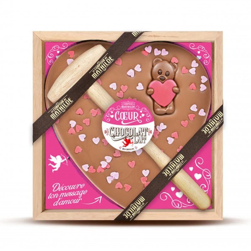 Chocolat au LAIT 92,85% (sucre, beurre de cacao, poudre de LAIT entier, pâte de cacao, émulsifiant : lécithine de SOJA, arôme naturel de vanille. Cacao : 33% minimum), décor chocolaté 3,91% (sucre, beurre de cacao, LAIT entier en poudre, pâte de cacao, LAIT maigre en poudre, concentré (carotte), émulsifiant : lécithine de SOJA, arôme naturel de vanille, colorant : E120), décor en sucre 3,24% (sucre, farine de riz, huile de riz, fécule de pomme de terre, arôme, jus concentré de betterave rouge, colorants : E101, E120).