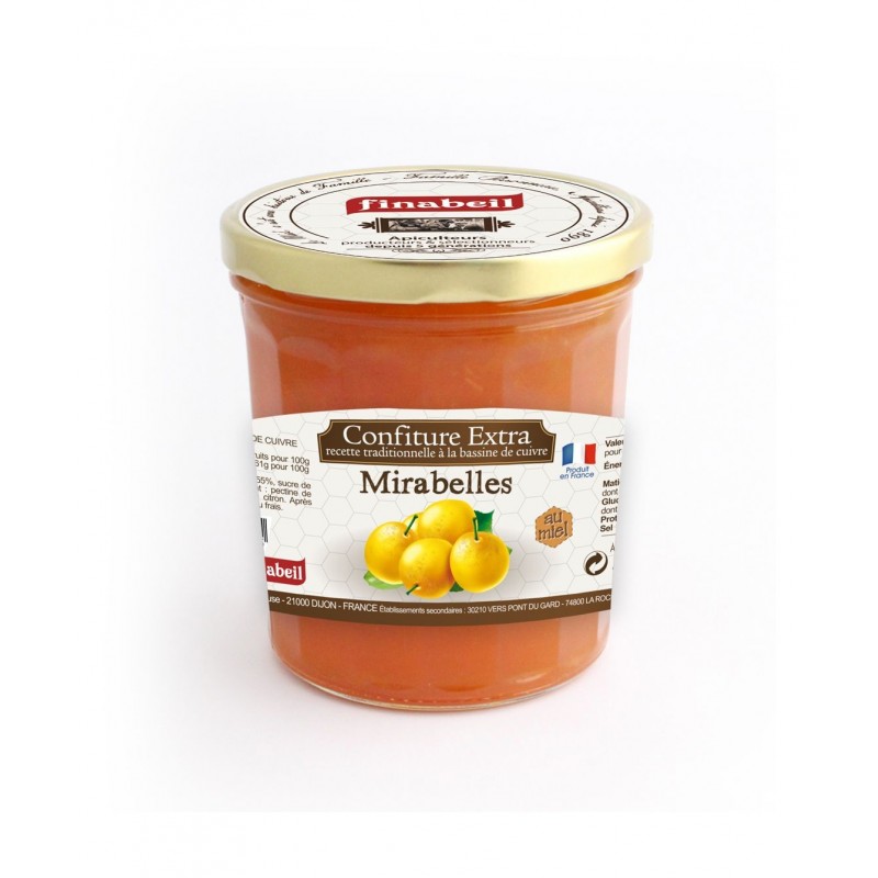 Mirabelle, sucre de canne, miel 6%, gélifiant (pectine de fruits), jus de citron.