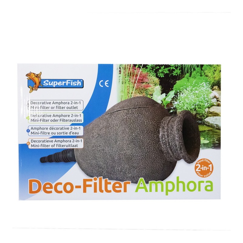 Décoration multifonction à installer au bord de votre bassin, sous la forme d'une amphore, une Koi et une grenouille. Elle peut être utilisée comme un mini-filtre pour les petits bassins, ou comme une cascade décorative, afin d'embellir votre sortie d'eau de filtre à pression. Leur couvercle rend leur nettoyage aisé.