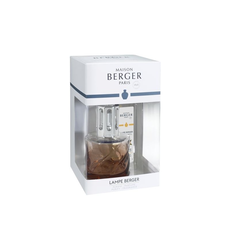 Le corps arrondi et torsadé rose ambré de la lampe spirale est accompagné d'un parfum de maison 250ml Eclat de Rhubarbe|
