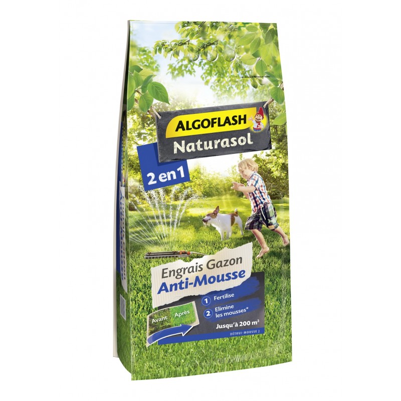 Engrais Anti-mousse à base d'un engrais organo-minéral et de sulfate de fer. Fertilise le gazon et élimine les mousses du gazon. Pour un gazon bien vert, dense et robuste