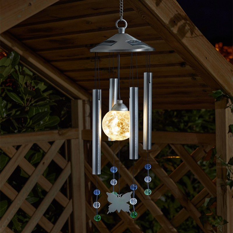 Carillon alimenté par un panneau solaire intégré qui illumine les LED cachées pour créer une jolie silhouette d'ombre la nuitParfait pour la décoration extérieure autour des patios et des pergolas/Contient un cerceau et un cordon pour accrocherGlobe en verre craquelé et LED blanc chaud, métal64 x 15 cm